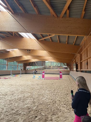Unsere moderne Reithalle mit Turniermaß 20m x 40m, biete optimale Trainingsmöglichkeiten für Pferd und Reiter. Dazu bieten wir eine Vielzahl an Utensilien an, die das Training noch abwechslungsreicher gestaltet. Hier können Sie nach Herzenslust Sprünge und Hindernisse aufbauen, um die Reitabläufe stetig zu verbessern oder den Trainingszustand zu erhalten. In der Halle integriert ist eine großzügige Tribüne sowie ein Putzplatz und ein Solarium für verschwitze Pferde. Unser stielvolles Reiter Stüberl (Saloon) steht Ihnen für einen Ausgedehnte Pause oder einen leckeren Cappuccino immer offen. Genießen Sie verschiede Kaffee Sorten oder auch gerne eine Tasse Tee, während Sie durch die Panoramafenster dem Treiben in der Halle folgen können. Der Reithallenboden besteht aus hochwertigem Sand, gemischt mit Textilfasern der Firma OTTO Reitplatzbau. Um das Reiterlebnis immer optimal zu gestalten, wird der Boden regelmäßig bewässert und abgezogen.